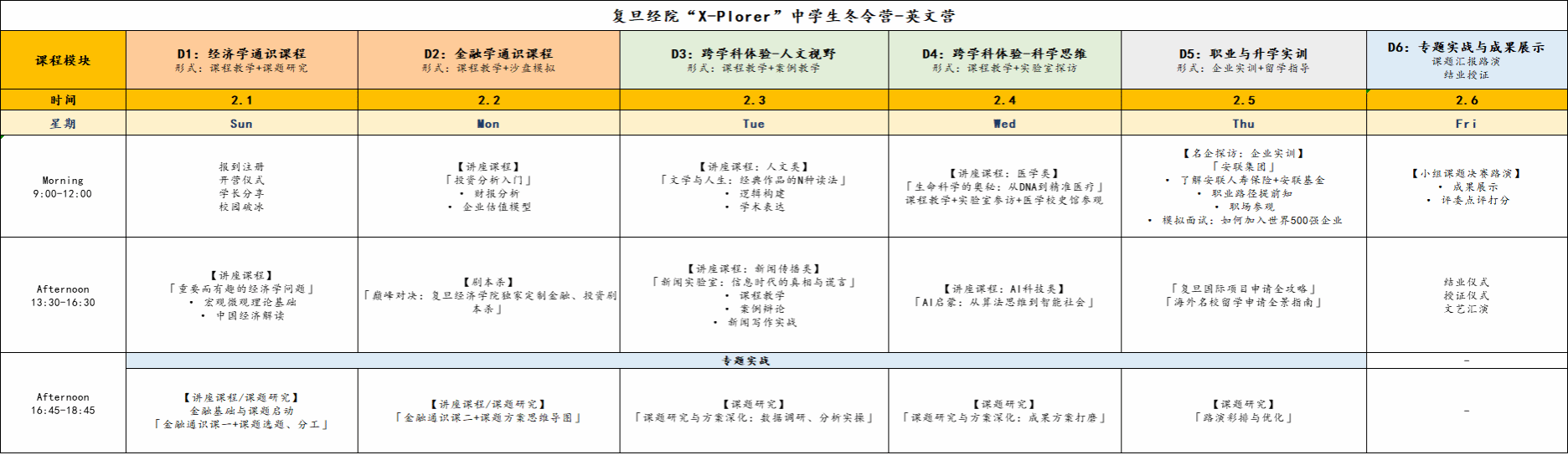项目为期六天,以全英文授课。依托复旦大学顶尖学术资源,为优秀中学生量身打造的沉浸式学术项目。项目设计基于复旦大学本科生培养模型 “2+X+Y”演化而来,采用三维赋能培养模式,旨在通过: