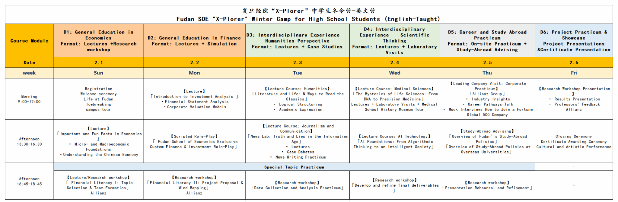 This is a six-day, fully English-taught immersive academic program drawing on Fudan University’s top academic resources. It is derived from Fudan’s undergraduate “2+X+Y” model and adopts a three-dimensional empowerment approach:
