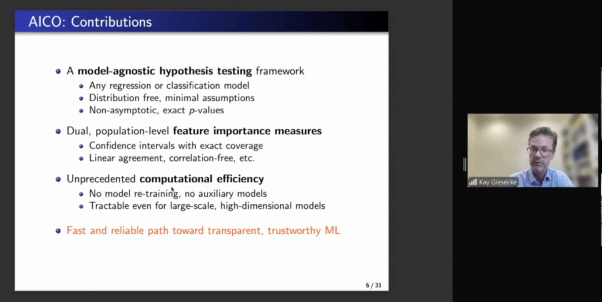 最后,Giesecke教授总结道,AICO 填补了机器学习实践与经典统计推断之间的长期鸿沟,为大规模应用提供了透明、可信的预测路径。其兼具统计严谨性、计算可扩展性和实践适用性的特点,有望成为机器学习可解释性的新标准,为科学、工业和政策领域的循证决策提供有力支持。