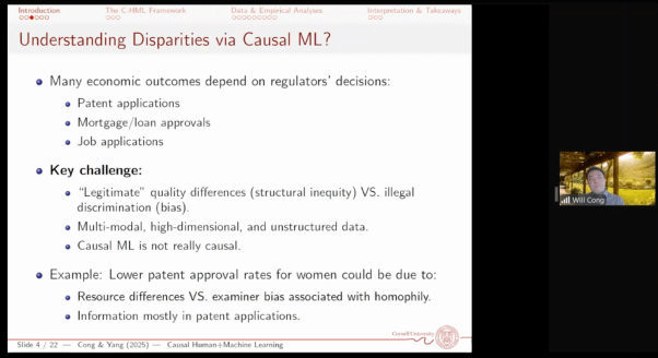 康奈尔大学商学院管理学讲席教授、金融学教授Lin William Cong发表了题为“Understanding Patenting Disparities via Causal Human + Machine Learning”的演讲,围绕“谁更容易拿到专利”这一看似技术却高度关乎机会公平的问题,系统介绍了其最新研究成果。