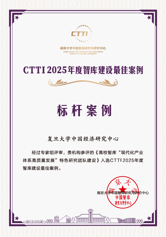 复旦大学中国经济研究中心参评的《高校智库“现代化产业体系高质量发展”特色研究团队建设》被评为CTTI 2025年度智库建设标杆案例。