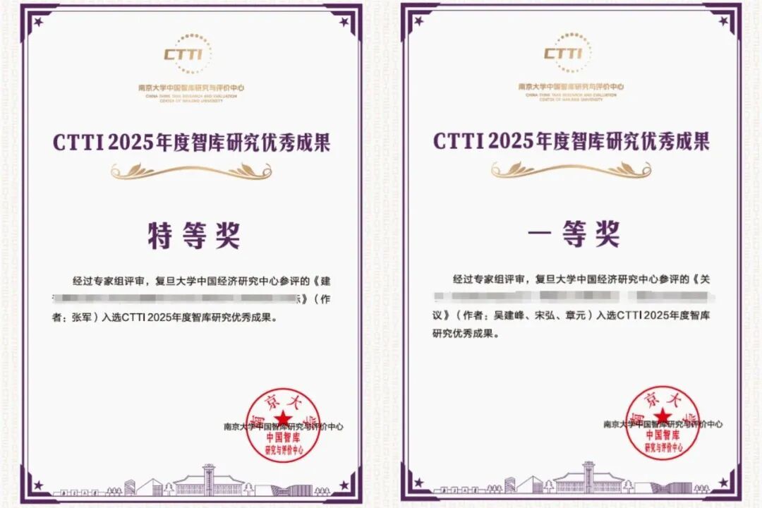 复旦大学中国经济研究中心参评的《建议将****作为2025年经济工作的核心目标》(作者:张军)荣获CTTI 2025年度智库研究优秀成果特等奖;《关于****的反应和修改建议》(作者:吴建峰、宋弘、章元)荣获CTTI 2025年度智库研究优秀成果一等奖。