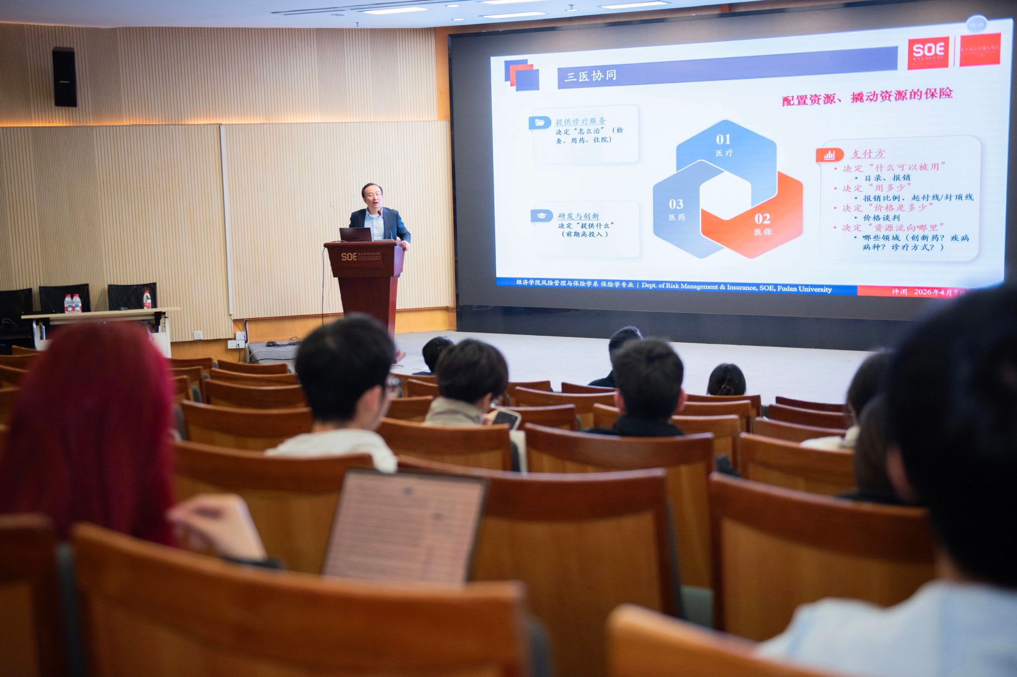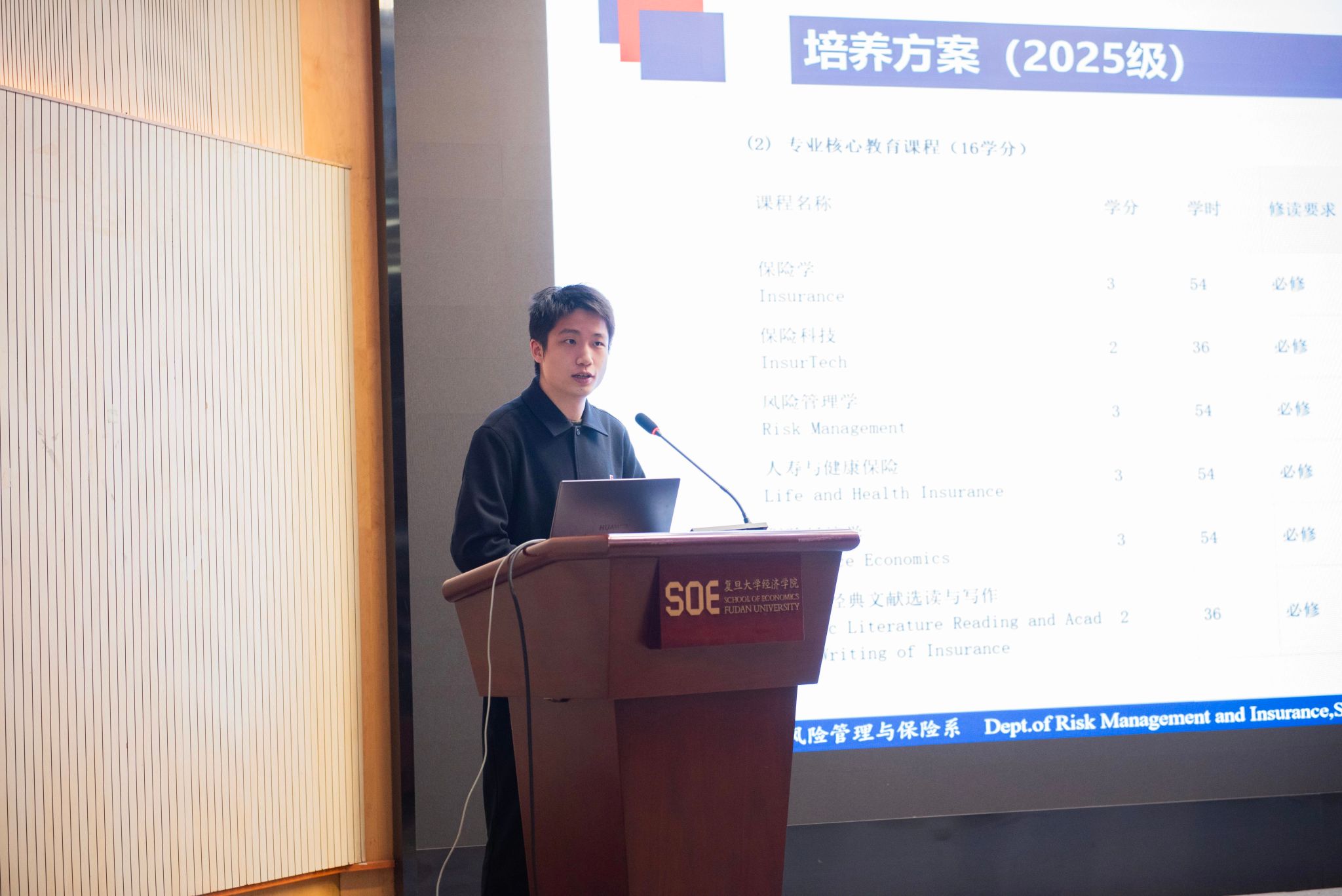 推介会伊始,风险管理与保险学系系主任许闲教授以“理解风险,建构制度,回应未来——走进保险学”为题,围绕“保险”二字的千年历史引经据典,娓娓道来。他指出,早在古代,商贾们便懂得将货物分散装载以抵御沧海风暴,这便是“风险分散”最朴素的智慧。而复旦的保险教育更是与时代同频共振:1919年商科开设保险学课程,1927年“保险原理”列为必修课程,自此打通了理论与实务的经脉。历经逾百年岁月洗礼,复旦保险教育的薪火愈发璀璨。