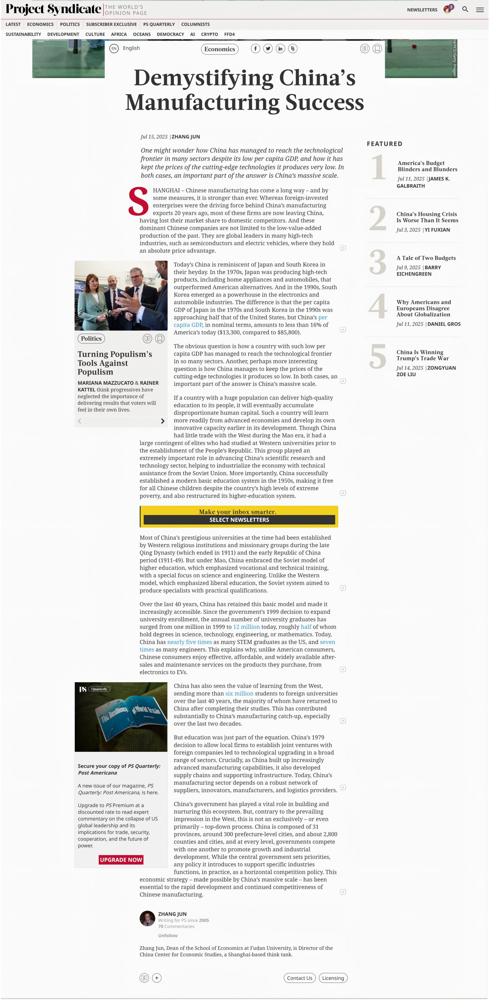 院长、中国经济研究中心主任张军教授在 Project Syndicate 发表深度分析文章Demystifying China’s Manufacturing Success。全文发表于 Project Syndicate,我们推送中文翻译版,并转发英文原文,以飨读者。
