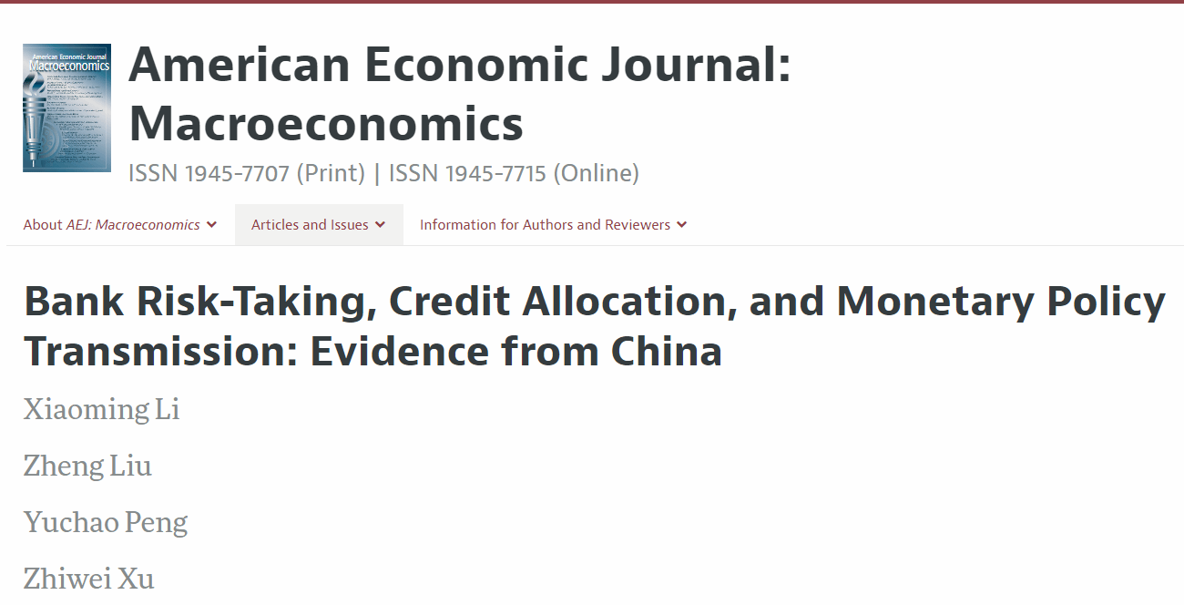 许志伟教授与三位合作者的研究论文 Bank Risk-Taking, Credit Allocation, and Monetary Policy Transmission: Evidence from China(银行风险承担、信贷配置与货币政策传导——来自中国的证据)在宏观经济学领域国际权威期刊American Economic Journal: Macroeconomics在线发表。