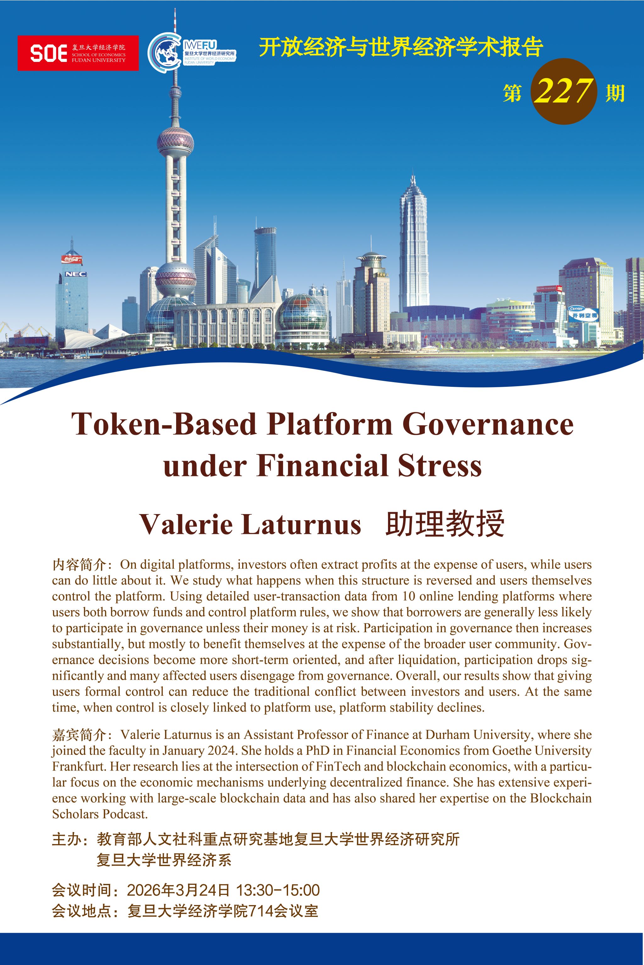 复旦大学世界经济研究所开放经济与世界经济学术报告第227期:Token-Based Platform Governance under Financial Stress