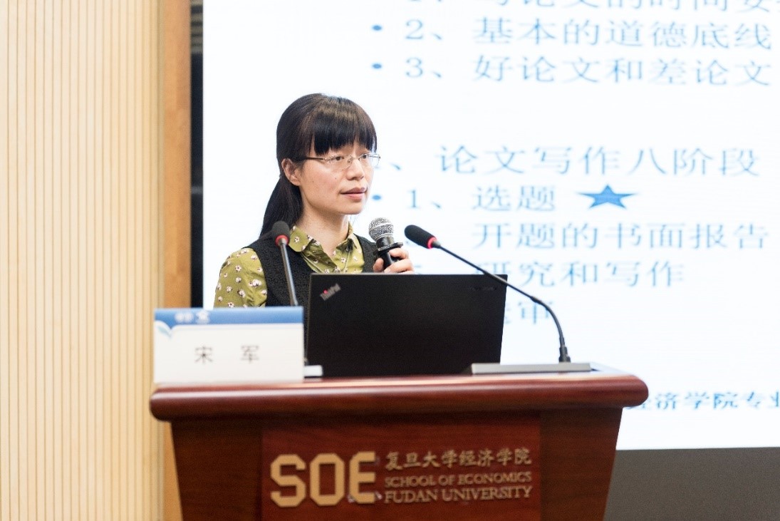 讲座第二部分是由宋军老师讲解的毕业论文写作指导。首先,宋老师就毕业论文写作时间安排、道德底线要求和优秀论文的标准等基本问题作了介绍,督促同学们合理分配时间和精力,踏实努力完成毕业论文。接着,宋老师重点就论文写作的八个阶段进行了讲解,这八个阶段分别是选题、查文献、开题的书面报告、开题的口头报告、研究和写作、提交终稿后查重、送审、毕业答辩。她认为,好的选题相当于成功的一半,她提醒大家要特别注意选题。之后,宋老师以金融专业硕士为例,分别对论文类型、问题类型、研究对象及其影响关系进行了详细指导。此外,宋老师对读文献的方法、开题报告写作要点、论文标题和摘要写法、毕业答辩注意事项等重点问题作了明确清晰的讲解。