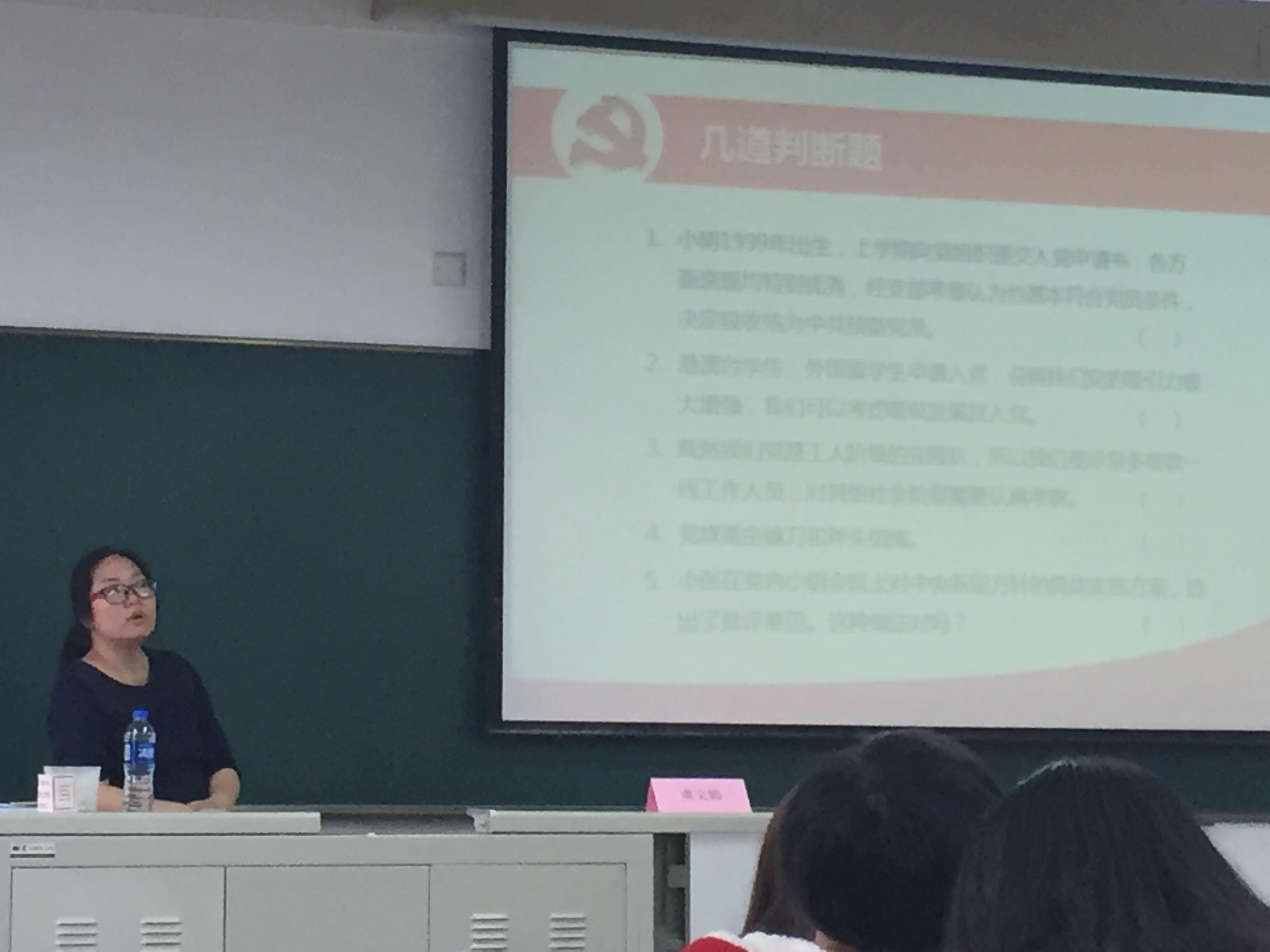 随后,希德书院学工组长虞文嫣老师为积极分子学员们带来入党基本理论的报告,介绍党员的权利义务与组织纪律。虞老师从前苏联的灭党的深刻教训给我们敲响了警钟谈起,告诫大家只有坚定不移地严抓和加强党的组织和纪律的建设,才能更好地巩固党的领导和更好地建设好党和国家。虞老师介绍道,随着共产党的不断发展壮大,党的各项规章制度也是越来越完善,党员的权利与义务也给广大党员清晰明确地规范了党员享有的权利。作为一个共产党员,要充分利用这些民主与权利,为人民谋取福利;同时,权利与义务是同在的,他们一向是辩证统一的,既然有权利,必然有义务。这就要求广大党员充分利用党员的权利,更好地为人民服务;履行党员应尽的义务,维护党的纲领与各项原则。当然要成为一个合格的共产党员,最基本的是要拥护党的纲领,遵守党的章程,履行党员的义务,执行党的决定,严守党的纪律。