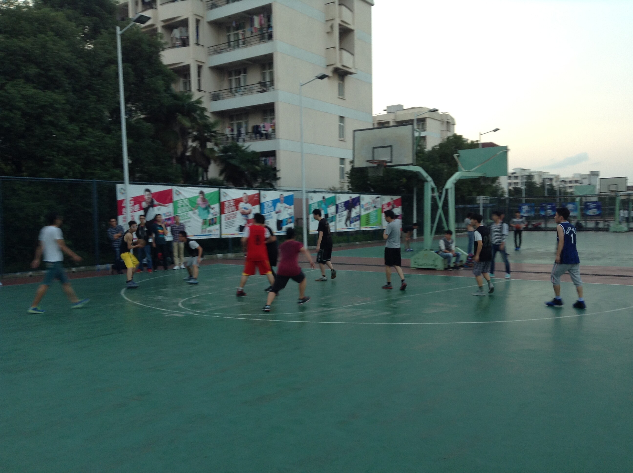 开赛前,双方在各自场地进行热身,即使前来参赛的队员不足5人,仍旧有说有笑,大四学长和研究生经历过太多的风雨,这些小事已经不会影响他们的心情了。在一番等待之后,双方终于凑齐了5人首发,比赛即将开始。