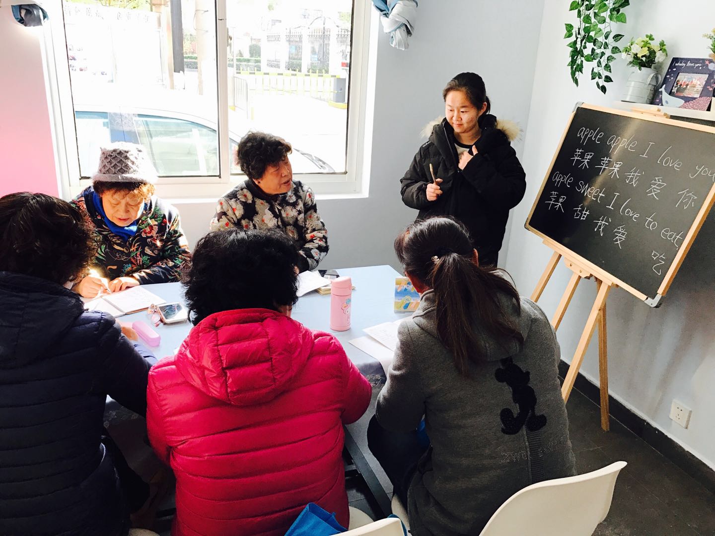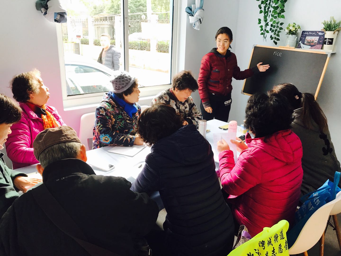 许雯:这次志愿者活动中,最让我感动的是他们的认真。老人们围坐在桌子旁,一笔一画地写下新学的单词和歌曲。甚至不时站起来,抄完黑板上的板书。听着他们整齐地念着字母,唱着歌,真的很羡慕他们的生活状态和心态了,学习不会因为年龄而有所区别,这些爷爷奶奶都是活到老学到老最好的践行者。