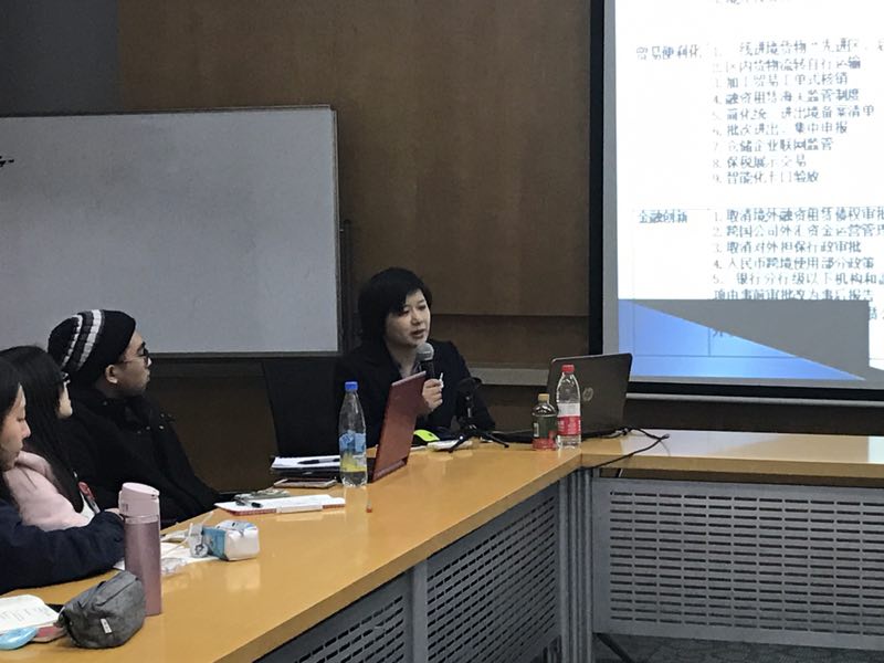 泛海楼614室,卢华老师为大家介绍了中国自由贸易试验区和其中体现的金融创新内容。