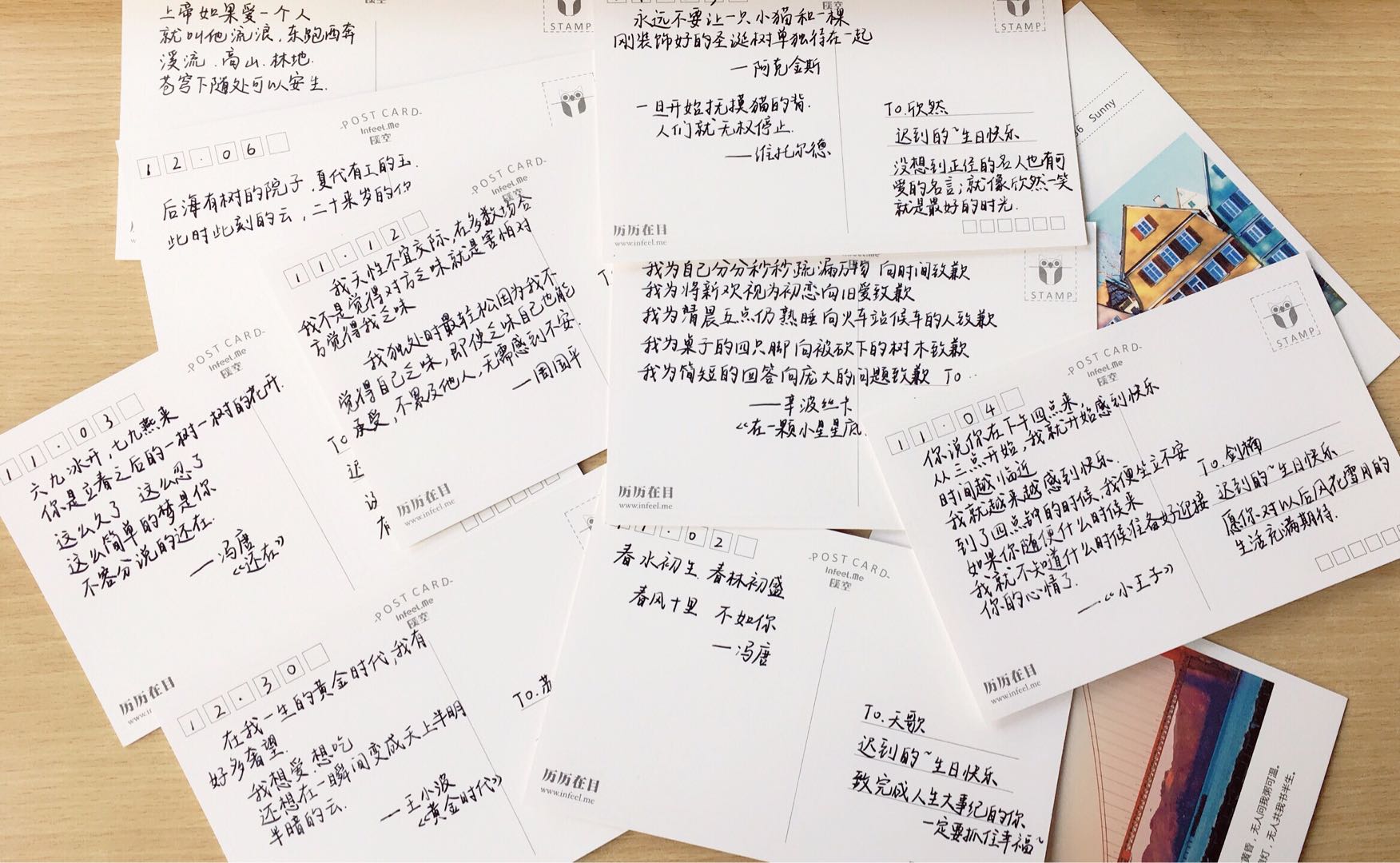 的同学中也引起了不小的反响。所谓国金人物专栏,是指班级公众号为过生日的同学开设的一个特色项目:每一期基本是寿星的好室友们提供素材,分享寿星的小故事、癖好、美照以及献上好友们的生日祝福,同时还会在当月的班会上为各位小寿星发放小蛋糕和生日祝福明信片,小蛋糕甜蜜可口,生日祝福明信片更是凝聚了生活委员的细心:上面手写着专属于小寿星的祝福以及赠送的一段话,字迹工整隽秀,内容更是摘录自王小波、冯唐、周国平等作家的名句,洋溢着诗意和人文情怀。