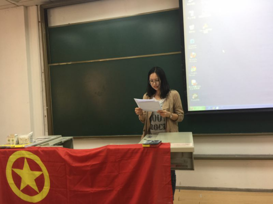 主题班会共包括三个环节,首先是纸条征集环节。团支书及两位宣传委员陈昱方同志、曹虹溪同志、卡米然·木拉提同志向每人发放了一张匿名小纸条,向大家征集写下“你认为的复旦的校风学风体现在哪里”。经过回收与上台读纸条的环节,大家通过匿名的方式,表达了自己对学风校风的意见,包括对学风校风的肯定与反思,如“期末季灯火通明的三角自习室”、“下课围在老师身边提问的同学”、“部分水课头也不抬的大部分同学”、“其他课上写国贸作业,国贸课上写其他作业”等等,说出了大家的心里话,深化了大家对复旦校风学风的认识。
