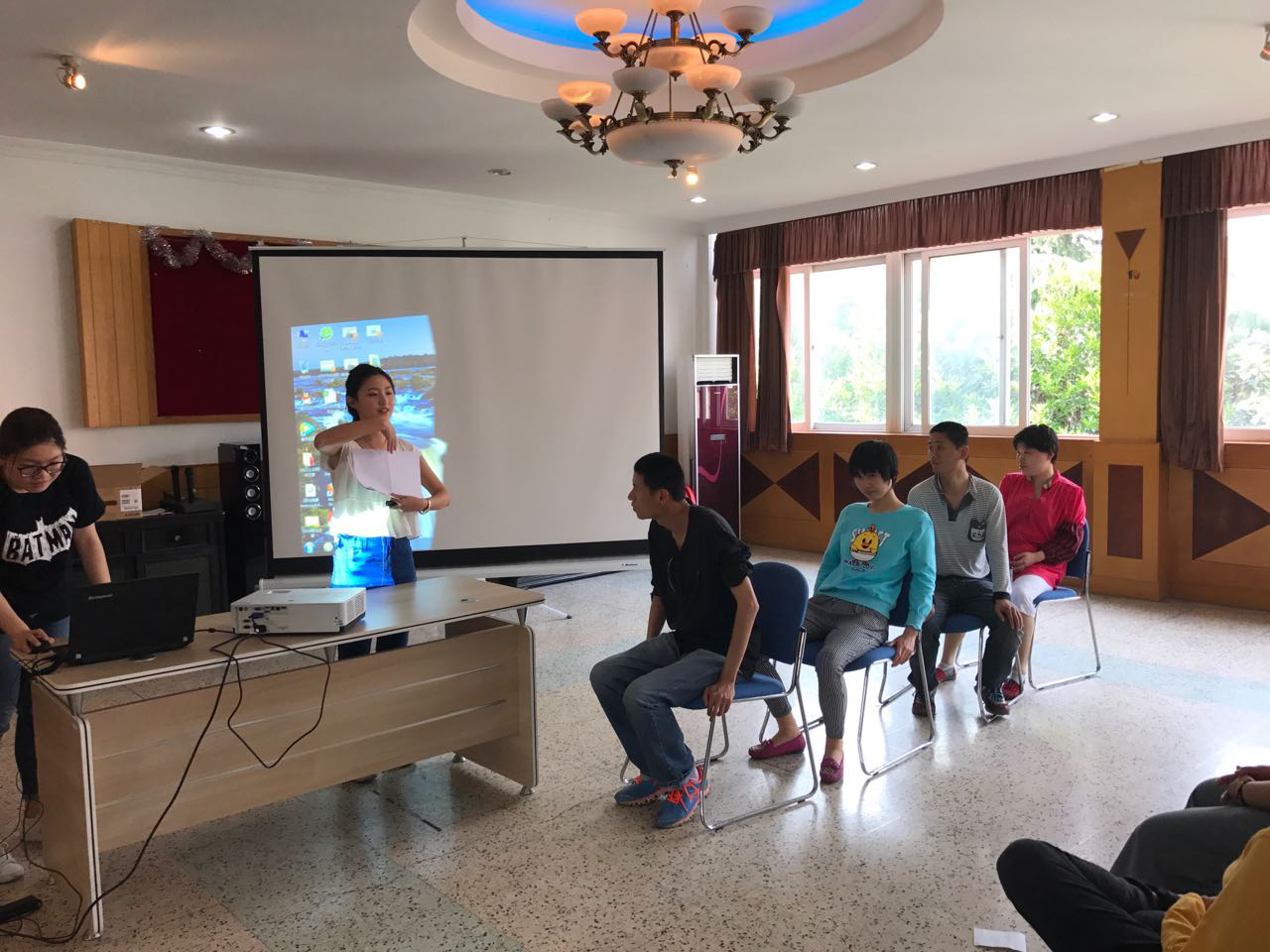 对于初来乍到的志愿者们,阳光之家的学员们都表现出了极大的热情和友善。短暂的自我介绍后,志愿者们开始了第一个游戏:传话。志愿者们将15位成员分为3组,每组按前后顺序排好。给每组第一位同学看卡片上的动物,第一位同学用肢体语言向第二位同学传话,再由第二位同学传给后一位同学,以此类推,直至最后一位同学。最后一位同学大声说出他猜测的动物。一开始,由于不太熟悉规则,同学们的进展非常缓慢,在志愿者的循循善诱下才完成游戏。熟悉规则后,学员们就玩得不亦乐乎了,大厅里不时发出笑声。