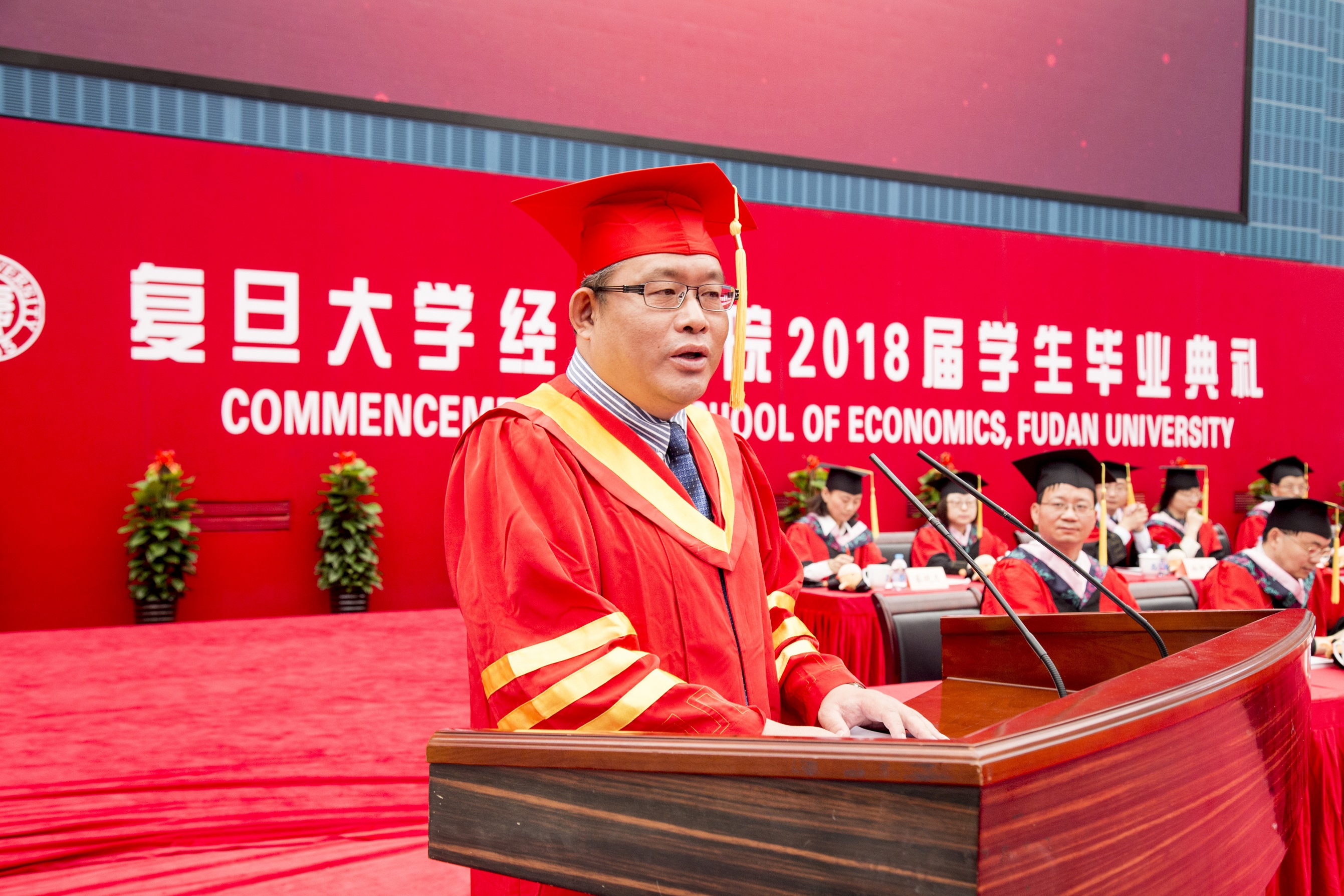 党委书记陈诗一教授为本届毕业生致辞。陈老师首先表示今天是一个重要的、大喜的日子,代表学院表达了对全体毕业生最衷心、最热烈的祝贺。接着陈老师回顾了复旦经院悠久的历史传统和近些年学院在学科建设上取得的优异成绩,并勉励在座的2018届毕业生在改革开放四十周年之际,勇担时代赋予之重任,胸怀家国之情怀,为社会、国家和民族做出自己的贡献。最后,陈书记给毕业生们提出三点建议。首先,要坚持初心。希望在座的每位毕业生,在面对未来的种种压力和诱惑时,能够永远坚守良心道德,坚持自己最初的理想。其次,要学会观察、分析和思考。在面对问题或困惑的时候,也要有做学问的精神,不能只想着“怎么解决”,而是要多问问“为什么”,有时候解释现象比解决问题更重要。最后,要有开放的眼光。改革开放四十年,中国经济已经处于全球价值链之中,希望同学们今后能够更加放宽视野,在不同文化碰撞中学习和创新,在国际舞台上发出更响亮的声音。