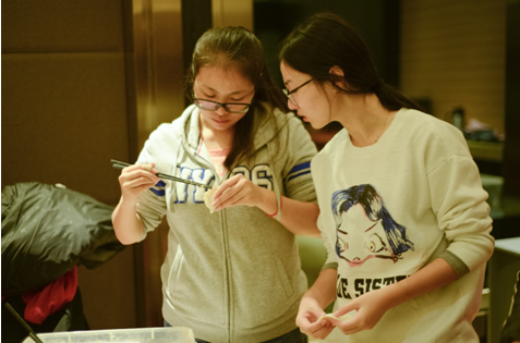 上午十时许,参加活动的老师和同学们齐聚燕园宾馆二楼,开始了当天活动的第一个环节:自己动手包饺子。现场的各位同学和老师一边合作包饺子,一边互相交流最近的学习、工作、生活情况,显得其乐融融。不知不觉一个多小时过去了,几大盘饺子在谈笑之间制作完毕,交由厨房下锅烹煮。
