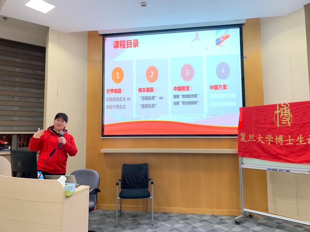 泛海楼205会议室参加了主题为“市场决定,政府有为”的学习会,本次学习会由复旦大学博士生讲师团的杨洁萌为我们讲授。为增强支部活动的辐射力、影响力,依托党支部的3个本科生班级:2016级经济学系党章学习小组、2017级经济学系党章学习小组、2018级人妻
