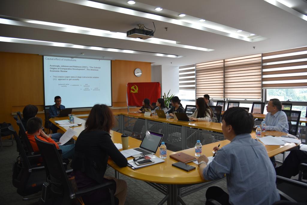 2019年5月14日,支部与学院经济学系教师党支部在泛海楼514会议室举行共建活动,旨在邀请资深教授和一线的专业教师指导课程内容的科学性及备课的逻辑性。活动在支部书记万颖聪的主持下进行,教师支部书记汪立鑫、党员高帆、杭行、冯剑亮、韦潇、高虹共6位老师参与了本次评审活动。在6位老师进行集中书面评审后,支部成员、党章学习小组成员逐一上台进行试讲展示,在每位同学试讲结束后,老师们针对同学们的问题提出了意见和建议,并就宣讲主题的范围选取、受众的实际需求、知识的广度和深度等方面进行了详尽的指导。