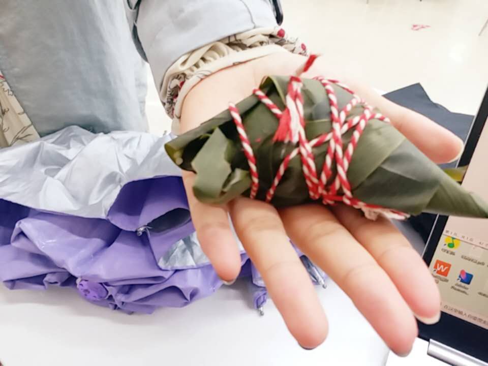 随后,同学们陆续到达了目的地,食堂阿姨开始了包粽子教学活动。只见阿姨拿起两片粽叶,灵巧地叠成漏斗状,加入米和填充料,紧接着拿起彩色的绳子“五花大绑”,一个漂亮的粽子就完成了!随后,同学们照葫芦画瓢,开工了。经历了不知道如何以及漏米粽子等危机后,50个粽子横空出世!粽子下锅期间,为了让同学们拥有更好的活动体验,文艺委员还策划了制作蛋挞的环节。考虑到时间的因素,负责采购的同学直接购买了蛋挞皮和蛋挞液,便于同学们简单加工。