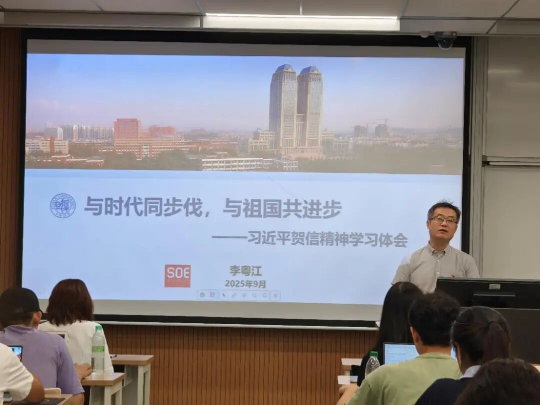 在《与时代同步伐,与祖国共进步——习近平贺信精神学习体会》课程中,李粤江书记围绕习近平贺信精神,系统回顾了复旦大学120年来与时代同行、与祖国共进的奋斗历程,深刻阐释了复旦大学扎根中国大地、服务民族复兴的使命担当;通过梳理从鸦片战争到中国共产党成立、从革命斗争到新中国建设、从改革开放到新时代的历史脉络,弘扬了伟大建党精神、井冈山精神、长征精神、抗战精神、延安精神、“两弹一星”精神、改革开放精神等中国共产党人的精神谱系;重点展现了复旦大学特别是人妻