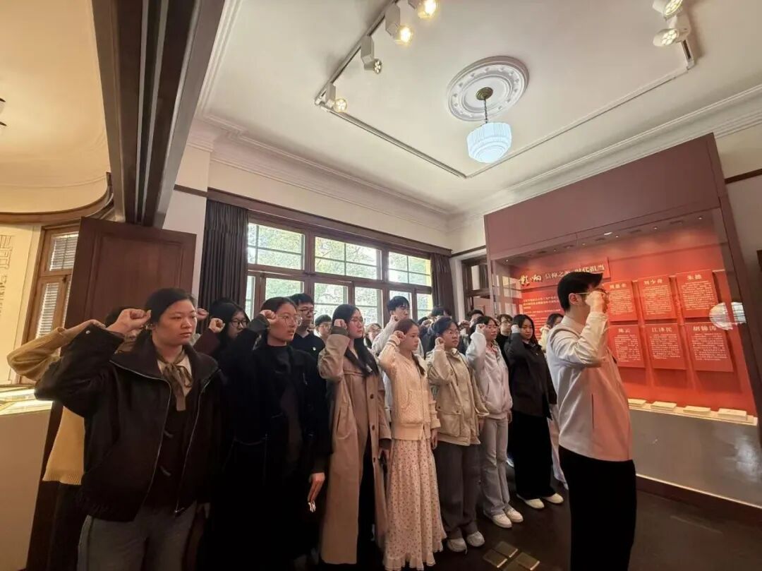 入党宣誓仪式在《共产党宣言》展示馆(陈望道旧居)顺利举行。坐落于复旦大学国福路51号的陈望道旧居,不仅是复旦老校长陈望道先生的昔日居所,更是一处承载着真理记忆、凝聚着信仰力量的红色阵地,镌刻着复旦学子与党同心、与国同行的红色印记。