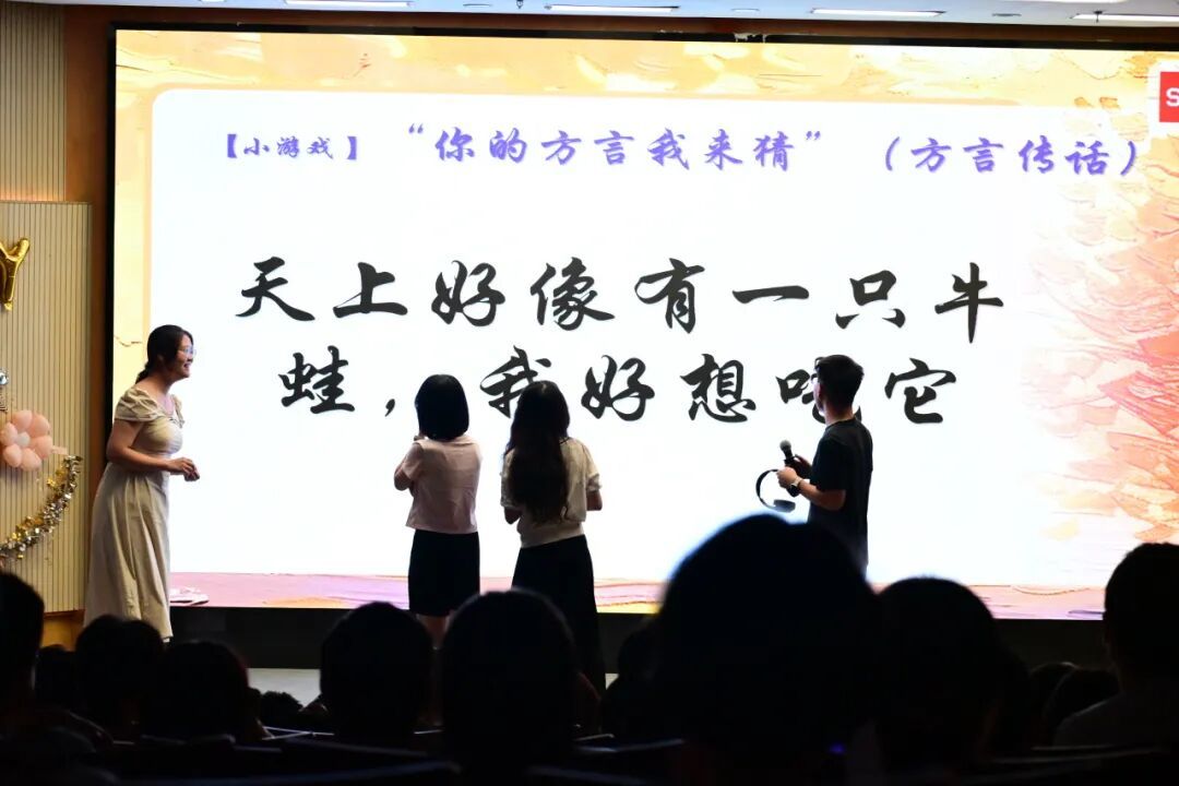 第三轮游戏 “加密通话:方言传话” 超有梗,来自五湖四海的同学们的家乡方言差异巨大,游戏接龙传话中发音跑偏、语义走样的乌龙频现,台下观众们的笑声此起彼伏。千差万别的乡音在此相遇,在欢声笑语中织就了独一无二的青春记忆。